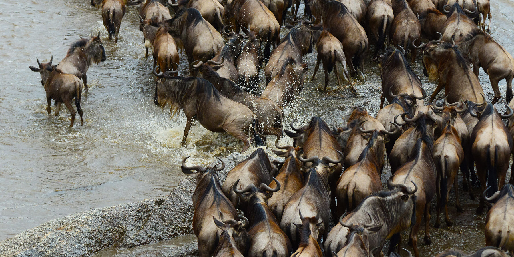 The Great Migration of Wildebeest across the savannah is the largest mammal migration on earth. Every year, more than 2 million Wildebeest, or Gnu, travel from the southern Serengeti to the Masai Mara in Kenya. This seasonal migration closely resembles the circle of life itself. From December through April, the herd inhabits the southeastern part of the Serengeti, raising their young in the lush grasses brought by the rains. They begin their annual migration north in May and will ultimately travel more than 500 miles to the Masai Mara in Kenya. Along the way they face hungry predators – from hungry prides of lions to vicious crocodiles. Their journey culminates at the Mara River, where they must make the treacherous crossing into Kenya.